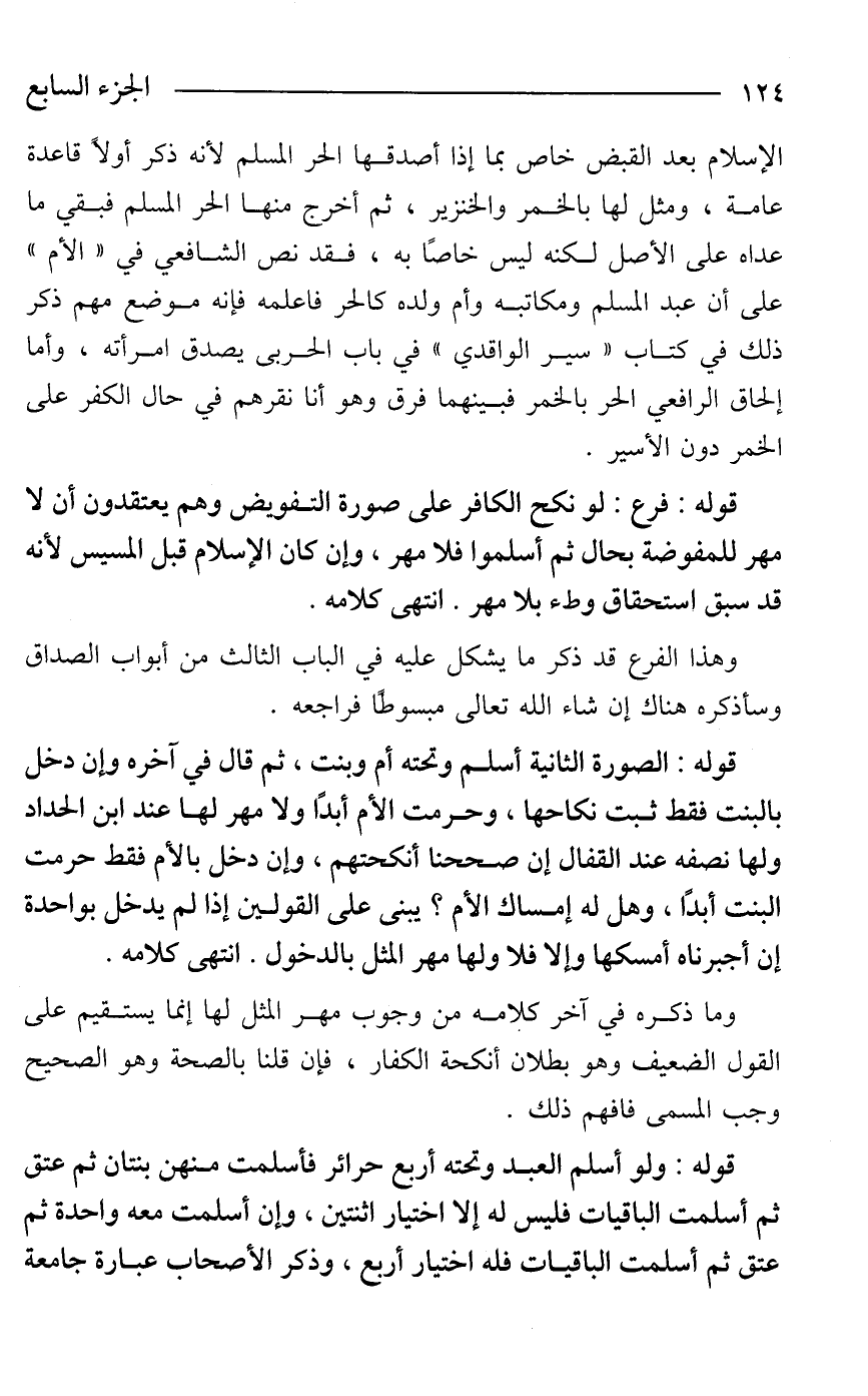 الإسلام بعد القبض خاص بما إذا أصدقها الحر المسلم لأنه ذكر أولًا قاعدة عامة، ومثل لها بالخمر والخنزير، ثم أخرج منها الحر المسلم فبقي ما عداه على الأصل لكنه ليس خاصًا به، فقد نص الشافعي في "الأم" على أن عبد المسلم ومكاتبه وأم ولده كالحر فاعلمه فإنه موضع مهم ذكر ذلك في كتاب "سير الواقدي" في باب الحربى يصدق امرأته، وأما إلحاق الرافعي الحر بالخمر فبينهما فرق وهو أنا نقرهم في حال الكفر على الخمر دون الأسير.
