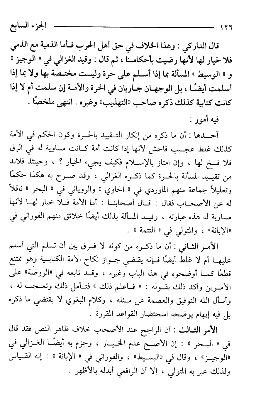 أحدها: أن ما ذكره من إنكار التقييد بالحرة وكون الحكم في الأمة كذلك غلط عجيب فاحش لأنها إذا كانت أمة كانت مساوية له في الرق فلا فسخ لها، وإن امتاز بالإسلام فكيف يجيء الخيار؟ ، وحينئذ فلابد من تقييد المسألة بالحرة كما ذكره الغزالي، وقد صرح به هكذا حكمًا وتعليلًا جماعة منهم الماوردي في "الحاوي" والروياني في "البحر" ناقلًا له عن الأصحاب فقال: قال أصحابنا: أما الأمة فلا خيار لها لأنها مساوية له هذه عبارته، وقيد المسألة بذلك أيضًا خلائق منهم الفوراني في "الإبانة"، والمتولي في "التتمة".