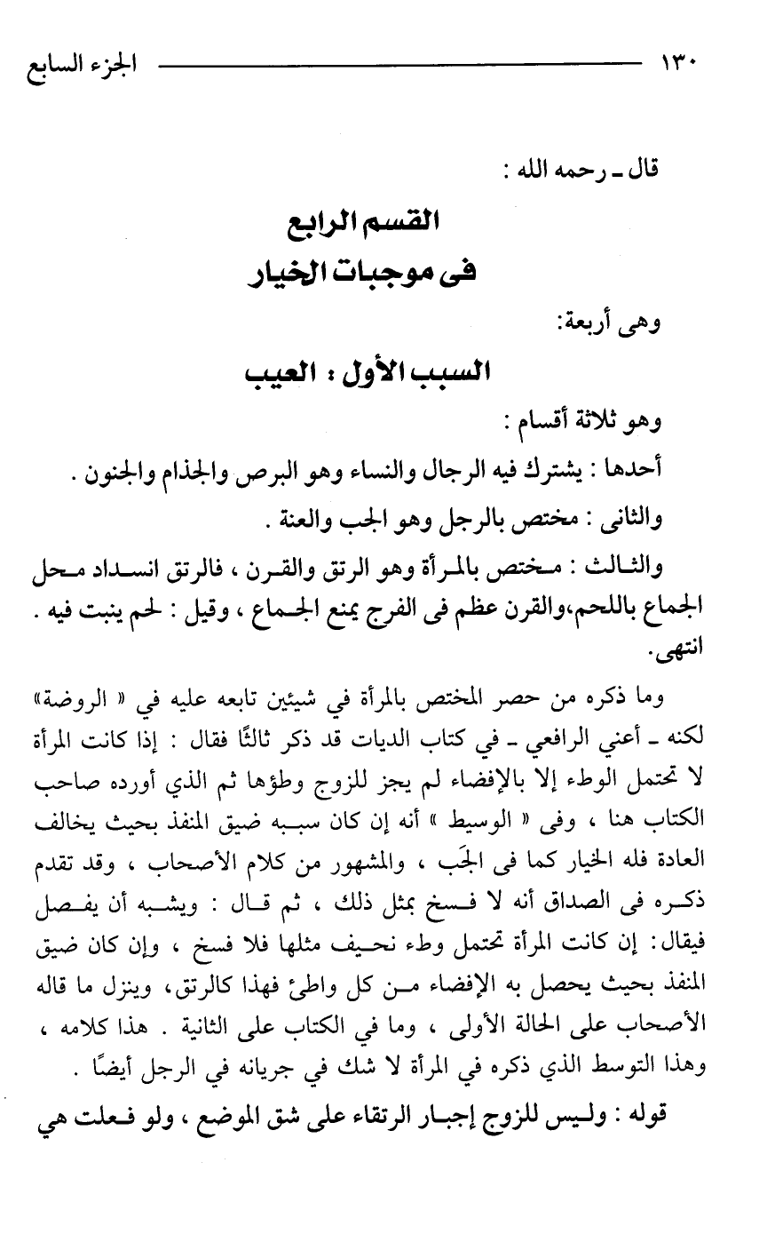 وما ذكره من حصر المختص بالمرأة في شيئين تابعه عليه في "الروضة" لكنه -أعني الرافعي- في كتاب الديات قد ذكر ثالثًا فقال: إذا كانت المرأة لا تحتمل الوطء إلا بالإفضاء لم يجز للزوج وطؤها ثم الذي أورده صاحب الكتاب هنا، وفى "الوسيط" أنه إن كان سببه ضيق المنفذ بحيث يخالف العادة فله الخيار كما في الجَب، والمشهور من كلام الأصحاب، وقد تقدم ذكره في الصداق أنه لا فسخ بمثل ذلك، ثم قال: ويشبه أن يفصل فيقال: إن كانت المرأة تحتمل وطء نحيف مثلها فلا فسخ، وإن كان ضيق المنفذ بحيث يحصل به الإفضاء من كل واطئ فهذا كالرتق، وينزل ما قاله الأصحاب على الحالة الأولى، وما في الكتاب على الثانية. هذا كلامه، وهذا التوسط الذي ذكره في المرأة لا شك في جريانه في الرجل أيضًا.