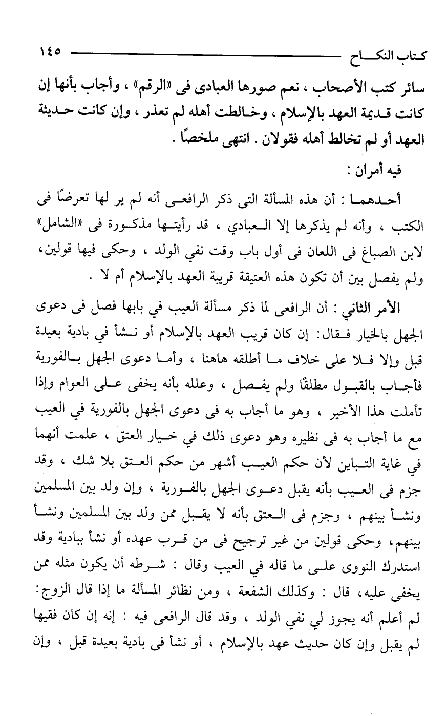 أحدهما: أن هذه المسألة التى ذكر الرافعى أنه لم ير لها تعرضًا في الكتب، وأنه لم يذكرها إلا العبادي، قد رأيتها مذكورة في "الشامل" لابن الصباغ في اللعان في أول باب وقت نفي الولد، وحكى فيها قولين، ولم يفصل بين أن تكون هذه العتيقة قريبة العهد بالإسلام أم لا.