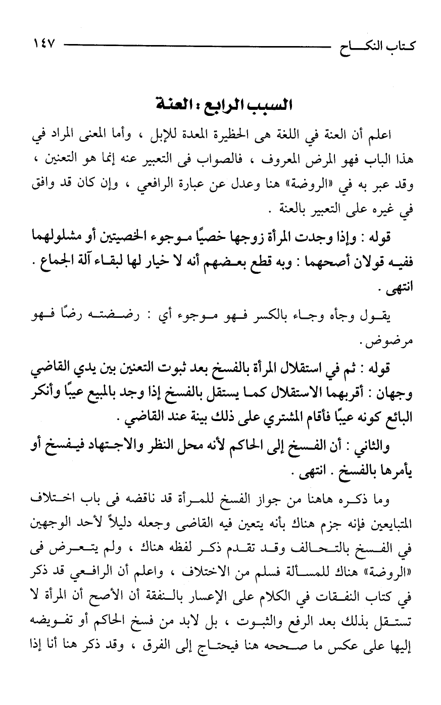 اعلم أن العنة في اللغة هى الحظيرة المعدة للإبل، وأما المعنى المراد في هذا الباب فهو المرض المعروف، فالصواب في التعبير عنه إنما هو التعنين، وقد عبر به في "الروضة" هنا وعدل عن عبارة الرافعي، وإن كان قد وافق في غيره على التعبير بالعنة.