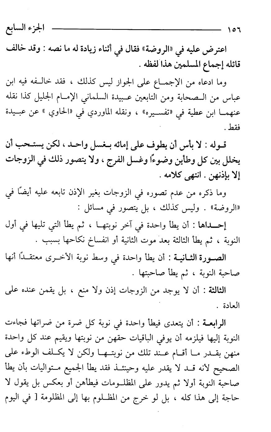 الرابعة: أن يتعدى فيطأ واحدة في نوبة كل ضرة من ضراتها فجاءت النوبة إليها فيلزمه أن يوفي الباقيات حقهن من نوبتها ويقيم عند كل واحدة منهن بقدر ما أقام عند تلك من نوبتها ولكن لا يكلف الوطء على الصحيح لأنه قد لا يقدر عليه وحينئذ فقد يطأ الجميع متواليات بأن يطأ صاحبة النوبة أولا ثم يدور على المظلومات فيطأهن أو بعكس بل يقول لا حاجة إلى هذا كله، بل لو خرج من المظلوم بها إلى المظلومة [في اليوم