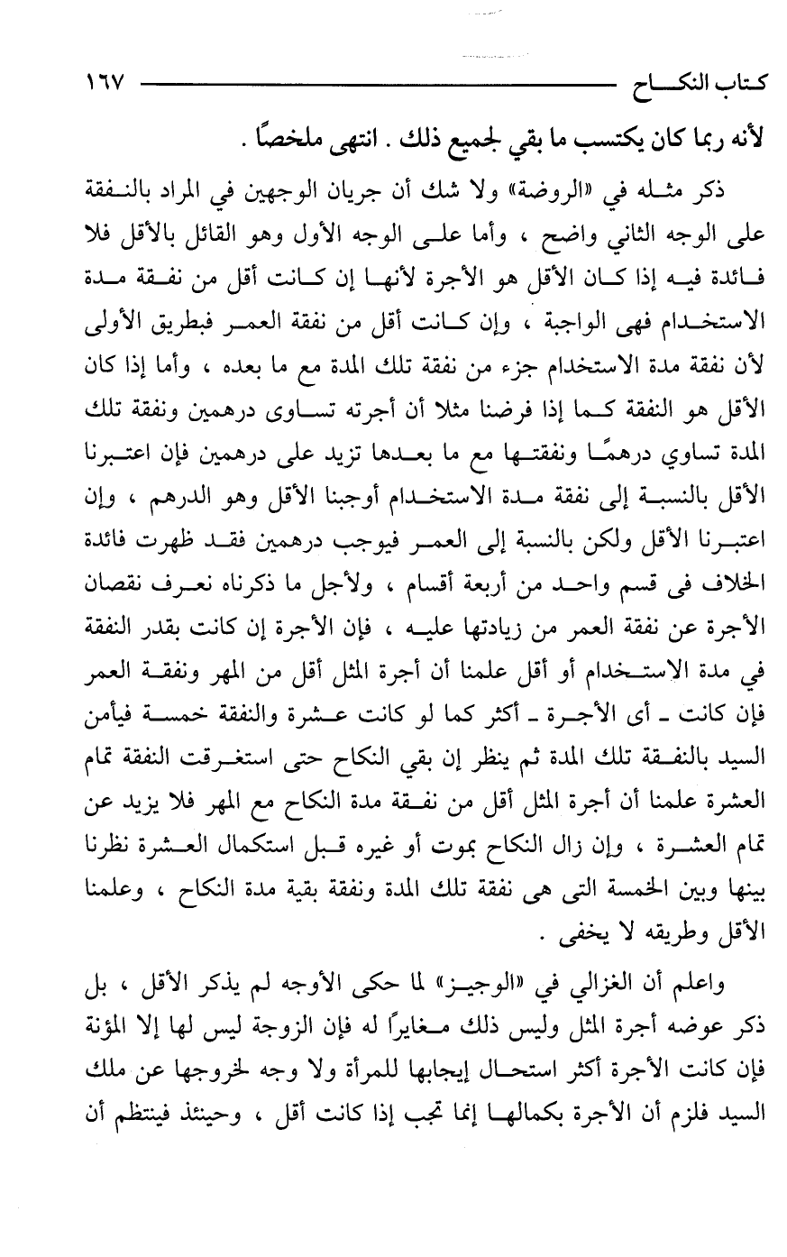 ذكر مثله في "الروضة" ولا شك أن جريان الوجهين في المراد بالنفقة على الوجه الثاني واضح، وأما على الوجه الأول وهو القائل بالأقل فلا فائدة فيه إذا كان الأقل هو الأجرة لأنها إن كانت أقل من نفقة مدة الاستخدام فهى الواجبة، وإن كانت أقل من نفقة العمر فبطريق الأولى لأن نفقة مدة الاستخدام جزء من نفقة تلك المدة مع ما بعده، وأما إذا كان الأقل هو النفقة كما إذا فرضنا مثلا أن أجرته تساوى درهمين ونفقة تلك المدة تساوي درهمًا ونفقتها مع ما بعدها تزيد على درهمين فإن اعتبرنا الأقل بالنسبة إلى نفقة مدة الاستخدام أوجبنا الأقل وهو الدرهم، وإن اعتبرنا الأقل ولكن بالنسبة إلى العمر فيوجب درهمين فقد ظهرت فائدة الخلاف في قسم واحد من أربعة أقسام، ولأجل ما ذكرناه نعرف نقصان الأجرة عن نفقة العمر من زيادتها عليه، فإن الأجرة إن كانت بقدر النفقة في مدة الاستخدام أو أقل علمنا أن أجرة المثل أقل من المهر ونفقة العمر فإن كانت -أى الأجرة- أكثر كما لو كانت عشرة والنفقة خمسة فيأمن السيد بالنفقة تلك المدة ثم ينظر إن بقي النكاح حتى استغرقت النفقة تمام العشرة علمنا أن أجرة المثل أقل من نفقة مدة النكاح مع المهر فلا يزيد عن تمام العشرة، وإن زال النكاح بموت أو غيره قبل استكمال العشرة نظرنا بينها وبين الخمسة التى هى نفقة تلك المدة ونفقة بقية مدة النكاح، وعلمنا الأقل وطريقه لا يخفى.