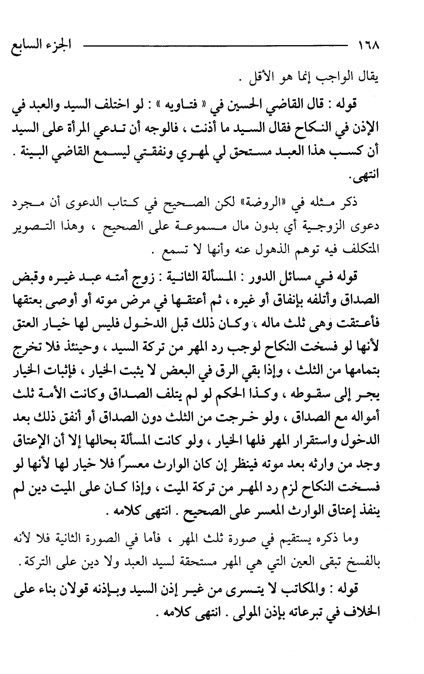 قوله في مسائل الدور: المسألة الثانية: زوج أمته عبد غيره وقبض الصداق وأتلفه بإنفاق أو غيره، ثم أعتقها في مرض موته أو أوصى بعتقها فأعتقت وهى ثلث ماله، وكان ذلك قبل الدخول فليس لها خيار العتق لأنها لو فسخت النكاح لوجب رد المهر من تركة السيد، وحينئذ فلا تخرج بتمامها من الثلث، وإذا بقي الرق في البعض لا يثبت الخيار، فإثبات الخيار يجر إلى سقوطه، وكذا الحكم لو لم يتلف الصداق وكانت الأمة ثلث أمواله مع الصداق، ولو خرجت من الثلث دون الصداق أو أنفق ذلك بعد الدخول واستقرار المهر فلها الخيار، ولو كانت المسألة بحالها إلا أن الإعتاق وجد من وارثه بعد موته فينظر إن كان الوارث معسرًا فلا خيار لها لأنها لو فسخت النكاح لزم رد المهر من تركة الميت، وإذا كان على الميت دين لم ينفذ إعتاق الوارث المعسر على الصحيح. انتهى كلامه.