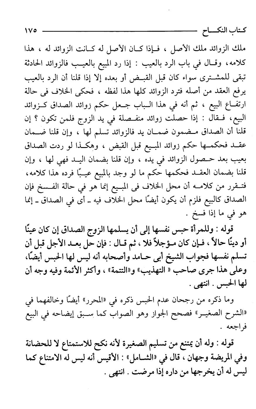 ملك الزوائد ملك الأصل، فإذا كان الأصل له كانت الزوائد له، هذا كلامه، وقال في باب الرد بالعيب: إذا رد المبيع بالعيب فالزوائد الحادثة تبقى للمشترى سواء كان قبل القبض أو بعده إلا إذا قلنا أن الرد بالعيب يرفع العقد من أصله فترد الزوائد كلها هذا لفظه، فحكى الخلاف في حالة ارتفاع البيع، ثم أنه في هذا الباب جعل حكم زوائد الصداق كزوائد البيع، فقال: إذا حصلت زوائد منفصلة في يد الزوج فلمن تكون؟ إن قلنا أن الصداق مضمون ضمان يد فالزوائد تسلم لها، وإن قلنا ضمان عقد فحكمها حكم زوائد المبيع قبل القبض، وهكذا لو ردت الصداق بعيب بعد حصول الزوائد في يده، وإن قلنا بضمان اليد فهي لها، وإن قلنا بضمان العقد فحكمها حكم ما لو وجد بالمبيع عيبًا فرده هذا كلامه، فتقرر من كلامه أن محل الخلاف في المبيع إنما هو في حالة الفسخ فإن الصداق كالبيع فلزم أن يكون أيضًا محل الخلاف فيه -أى في الصداق- إنما هو في ما إذا فسخ.