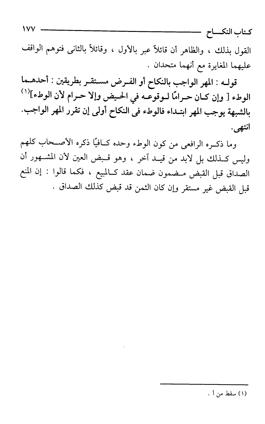 وما ذكره الرافعى من كون الوطء وحده كافيًا ذكره الأصحاب كلهم وليس كذلك بل لابد من قيد آخر، وهو قبض العين لأن المشهور أن الصداق قبل القبض مضمون ضمان عقد كالمبيع، فكما قالوا: إن المنع قبل القبض غير مستقر وإن كان الثمن قد قبض كذلك الصداق.