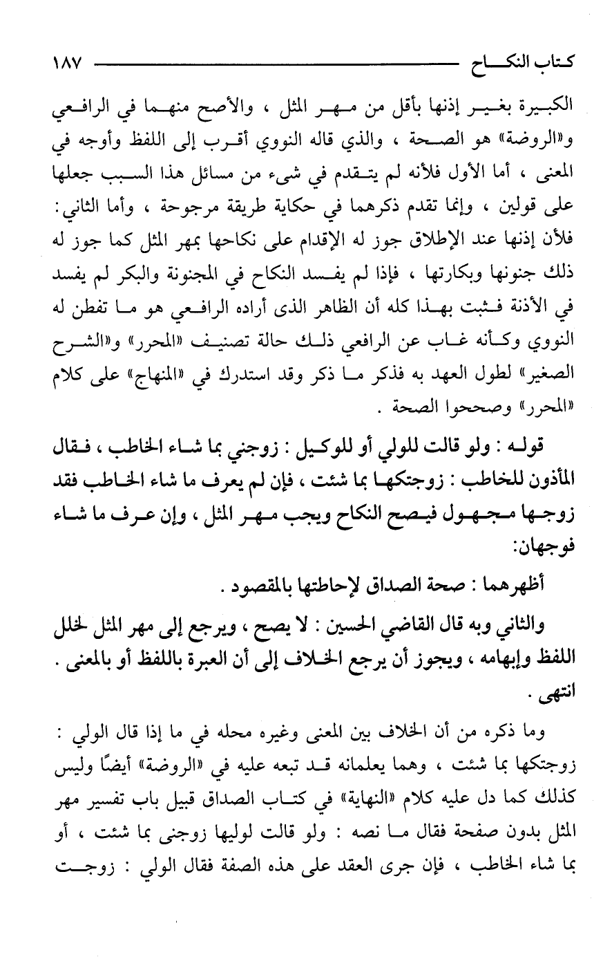 الكبيرة بغير إذنها بأقل من مهر المثل، والأصح منهما في الرافعي و"الروضة" هو الصحة، والذي قاله النووي أقرب إلى اللفظ وأوجه في المعنى، أما الأول فلأنه لم يتقدم في شئ من مسائل هذا السبب جعلها على قولين، وإنما تقدم ذكرهما في حكاية طريقة مرجوحة، وأما الثاني: فلأن إذنها عند الإطلاق جوز له الإقدام على نكاحها بمهر المثل كما جوز له ذلك جنونها وبكارتها، فإذا لم يفسد النكاح في المجنونة والبكر لم يفسد في الأذنة فثبت بهذا كله أن الظاهر الذى أراده الرافعي هو ما تفطن له النووي وكأنه غاب عن الرافعي ذلك حالة تصنيف "المحرر" و"الشرح الصغير" لطول العهد به فذكر ما ذكر وقد استدرك في "المنهاج" على كلام "المحرر" وصححوا الصحة.