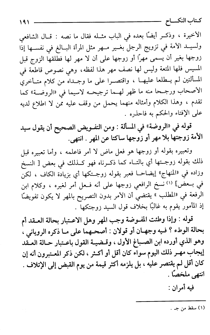 الأخيرة، وذكر أيضًا بعده في الباب مثله فقال ما نصه: قال الشافعي ولسيد الأمة في تزويج الرجل بغير مهر مثل المرأة البالغ في نفسها إذا زوجها بغير أن يسمى مهرًا أو زوجها على أن لا مهر لها فطلقها الزوج قبل المسيس فلها المتعة وليس لها نصف مهر هذا لفظه، وهي نصوص قاطعة في المسألتين لم يطلعا عليها، واقتصرا على ما وجداه من كلام متأخري الأصحاب ورجحا منه ما ظهر لهما ترجيحه لاسيما في "الروضة" كما تقدم، وهذا الكلام وأمثاله منهما يحمل من وقف عليه ممن لا اطلاع لديه على الإفتاء والحكم به فاحذره.