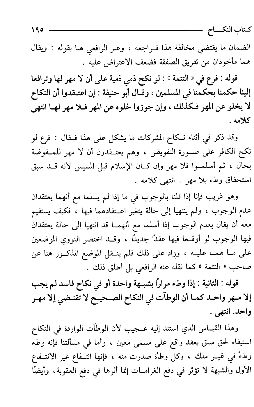 وهو غريب فإنا إذا قلنا بالوجوب في ما إذا لم يسلما مع أنهما يعتقدان عدم الوجوب، ولم ينتهيا إلى حالة يتغير اعتقادهما فيها، فكيف يستقيم معه أن يقال بعدم الوجوب إذا أسلما مع أنهما قد انتهيا إلى حالة يعتقدان فيها الوجوب لو أوقعا فيها عقدًا جديدًا، وقد اختصر النووي الموضعين على ما هما عليه، وزاد على ذلك فلم ينقل الموضع المذكور هنا عن صاحب "التتمة" كما نقله عنه الرافعي بل أطلق ذلك.