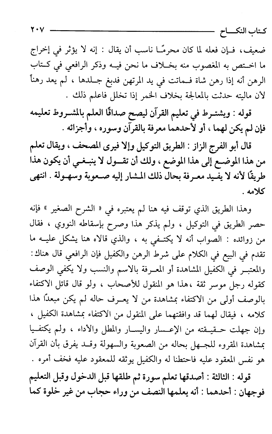 وهذا الطريق الذي توقف فيه هنا لم يعتبره في "الشرح الصغير" فإنه حصر الطريق في التوكيل، ولم يذكر هذا وصرح بإسقاطه النووي، فقال من زوائده: الصواب أنه لا يكتفي به، والذي قالاه هنا يشكل عليه ما تقدم في البيع في الكلام على شرط الرهن والكفيل فإن الرافعي قال هناك: والمعتبر في الكفيل المشاهدة أو المعرفة بالاسم والنسب ولا يكفي الوصف كقوله رجل موسر ثقة، هذا هو المنقول للأصحاب، ولو قال قائل الاكتفاء بالوصف أولى من الاكتفاء بمشاهدة من لا يعرف حاله لم يكن مبعدًا هذا كلامه، فيقال لهما قد وافقتهما على المنقول من الاكتفاء بمشاهدة الكفيل، وإن جهلت حقيقته من الإعسار واليسار والمطل والأداء، ولم يكتفيا بمشاهدة المقروء للجهل بحاله من الصعوبة والسهولة وقد يفرق بأن القرآن هو نفس المعقود عليه فاحتطنا له والكفيل يوثقه للمعقود عليه فخف أمره.