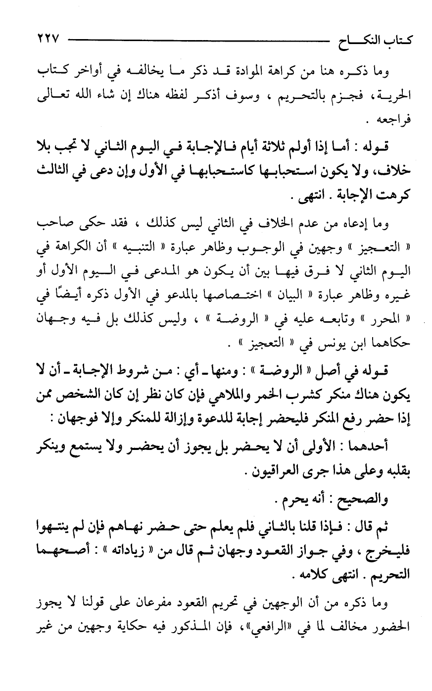 وما إدعاه من عدم الخلاف في الثاني ليس كذلك، فقد حكى صاحب "التعجيز" وجهين في الوجوب وظاهر عبارة "التنبيه" أن الكراهة في اليوم الثاني لا فرق فيها بين أن يكون هو المدعى في اليوم الأول أو غيره وظاهر عبارة "البيان" اختصاصها بالمدعو في الأول ذكره أيضًا في "المحرر" وتابعه عليه في "الروضة"، وليس كذلك بل فيه وجهان حكاهما ابن يونس في "التعجيز".