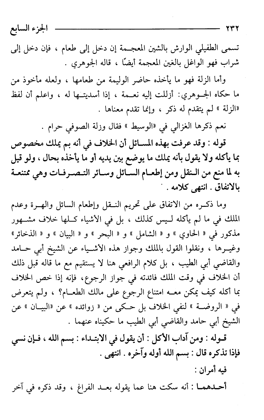وما ذكره من الاتفاق على تحريم النقل وإطعام السائل والهرة وعدم الملك في ما لم يأكله ليس كذلك، بل في الأشياء كلها خلاف مشهور مذكور في "الحاوي" و"الشامل" و"البحر" و"البيان" و"الذخائر" وغيرها، ونقلوا القول بالملك وجواز هذه الأشياء عن الشيخ أبي حامد والقاضي أبي الطيب، بل كلام الرافعي هنا لا يستقيم مع ما قاله قبل ذلك أن الخلاف في وقت الملك فائدته في جواز الرجوع، فإنه إذا خص الخلاف بما أكله كيف يمكن معه امتناع الرجوع على مالك الطعام؟ ، ولم يتعرض في "الروضة" لنفي الخلاف بل حكى من "زوائده" عن "البيان" عن الشيخ أبي حامد والقاضي أبي الطيب ما حكيناه عنهما.