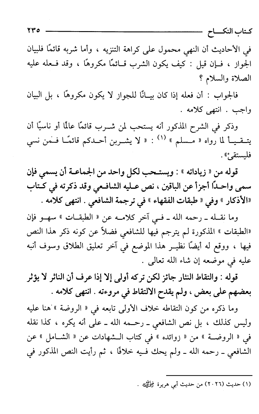 في الأحاديث أن النهي محمول على كراهة التنزيه، وأما شربه قائمًا فلبيان الجواز، فإن قيل: كيف يكون الشرب قائمًا مكروهًا، وقد فعله -عليه الصلاة والسلام-؟