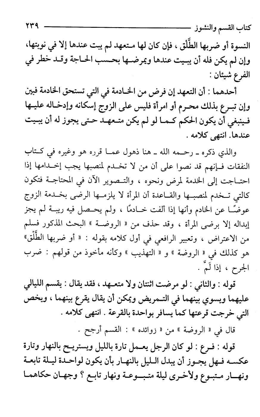 قوله: والثاني: لو مرضت اثنتان ولا متعهد، فقد يقال: يقسم الليالي عليهما ويسوي بينهما في التمريض ويمكن أن يقال يقرع بينهما، ويخص التي خرجت قرعتها كما يسافر بواحدة بالقرعة. انتهى كلامه.