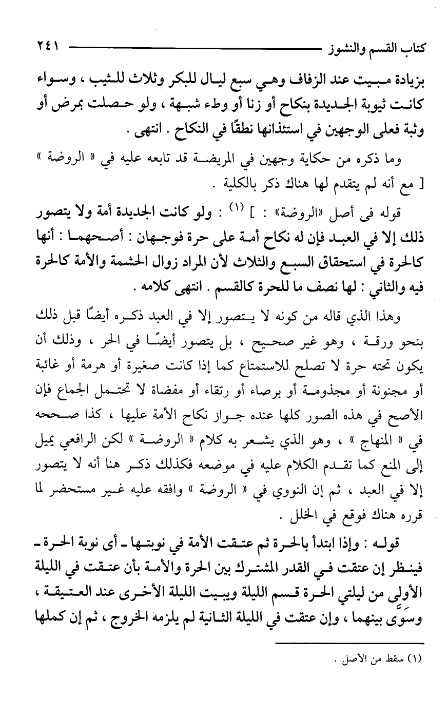 قوله في أصل "الروضة": ] (¬1): ولو كانت الجديدة أمة ولا يتصور ذلك إلا في العبد فإن له نكاح أمة على حرة فوجهان: أصحهما: أنها كالحرة في استحقاق السبع والثلاث لأن المراد زوال الحشمة والأمة كالحرة فيه والثاني: لها نصف ما للحرة كالقسم. انتهى كلامه.