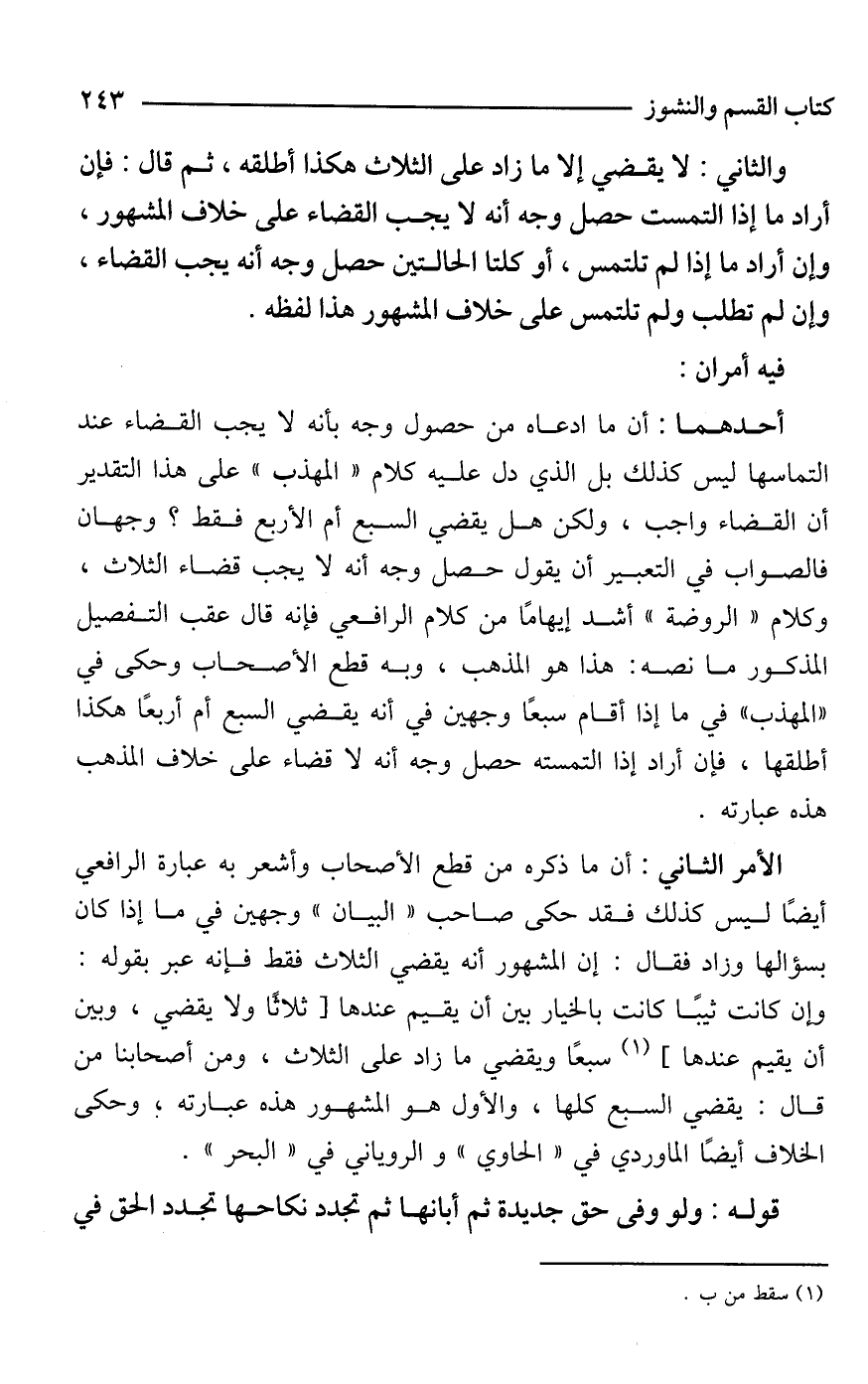 الأمر الثاني: أن ما ذكره من قطع الأصحاب وأشعر به عبارة الرافعي أيضًا ليس كذلك فقد حكى صاحب "البيان" وجهين في ما إذا كان بسؤالها وزاد فقال: إن المشهور أنه يقضي الثلاث فقط فإنه عبر بقوله: وإن كانت ثيبًا كانت بالخيار بين أن يقيم عندها [ثلاثًا ولا يقضي، وبين أن يقيم عندها] (¬1) سبعًا ويقضي ما زاد على الثلاث، ومن أصحابنا من قال: يقضي السبع كلها، والأول هو المشهور هذه عبارته؛ وحكى الخلاف أيضًا الماوردي في "الحاوي" والروياني في "البحر".
