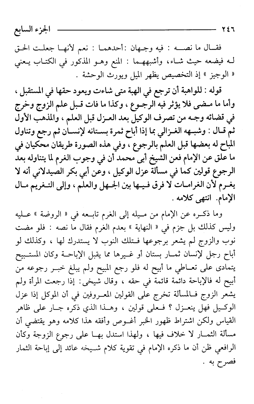 قوله: للواهبة أن ترجع في الهبة متى شاءت ويعود حقها في المستقبل، وأما ما مضى فلا يؤثر فيه الرجوع، وكذا ما فات قبل علم الزوج وخرج في قضائه وجه من تصرف الوكيل بعد العزل قبل العلم، والمذهب الأول ثم قال: وشبهه الغزالي بما إذا أباح ثمرة بستانه لإنسان ثم رجع وتناول المباح له بعضها قبل العلم بالرجوع، وفي هذه الصورة طريقان محكيان في ما علق عن الإمام فعن الشيخ أبي محمد أن في وجوب الغرم لما يتناوله بعد الرجوع قولين كما في مسألة عزل الوكيل، وعن أبي بكر الصيدلاني أنه لا يغرم لأن الغرامات لا فرق فيها بين الجهل والعلم، وإلى التغريم مال الإمام. انتهى كلامه.
