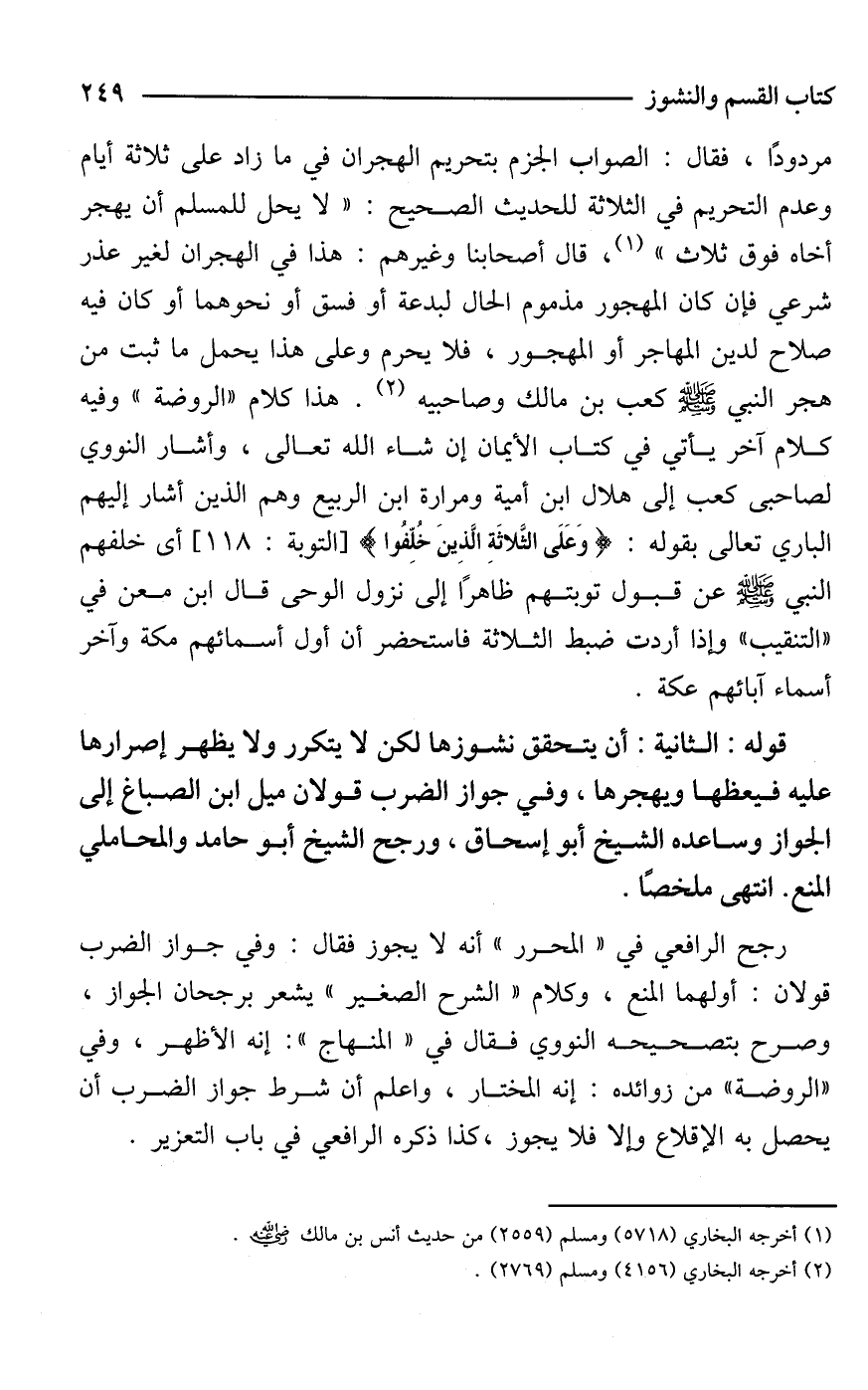 مردودًا، فقال: الصواب الجزم بتحريم الهجران في ما زاد على ثلاثة أيام وعدم التحريم في الثلاثة للحديث الصحيح: "لا يحل للمسلم أن يهجر أخاه فوق ثلاث" (¬1)، قال أصحابنا وغيرهم: هذا في الهجران لغير عذر شرعي فإن كان المهجور مذموم الحال لبدعة أو فسق أو نحوهما أو كان فيه صلاح لدين المهاجر أو المهجور، فلا يحرم وعلى هذا يحمل ما ثبت من هجر النبي - صَلَّى اللَّهُ عَلَيْهِ وَسَلَّمَ - كعب بن مالك وصاحبيه (¬2). هذا كلام "الروضة" وفيه كلام آخر يأتي في كتاب الأيمان إن شاء الله تعالى، وأشار النووي لصاحبى كعب إلى هلال بن أمية ومرارة بن الربيع وهم الذين أشار إليهم الباري تعالى بقوله: {وَعَلَى الثَّلَاثَةِ الَّذِينَ خُلِّفُوا} [التوبة: 118] أى خلفهم النبي - صَلَّى اللَّهُ عَلَيْهِ وَسَلَّمَ - عن قبول توبتهم ظاهرًا إلى نزول الوحي قال ابن معن في "التنقيب" وإذا أردت ضبط الثلاثة فاستحضر أن أول أسمائهم مكة وآخر أسماء آبائهم عكة.