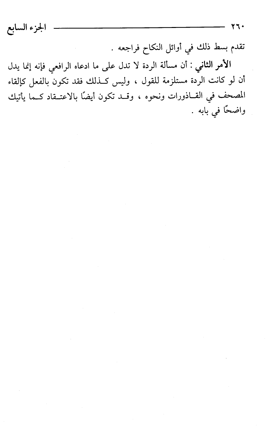 الأمر الثاني: أن مسألة الردة لا تدل على ما ادعاه الرافعي فإنه إنما يدل أن لو كانت الردة مستلزمة للقول، وليس كذلك فقد تكون بالفعل كإلقاء المصحف في القاذورات ونحوه، وقد تكون أيضًا بالاعتقاد كما يأتيك واضحًا في بابه.