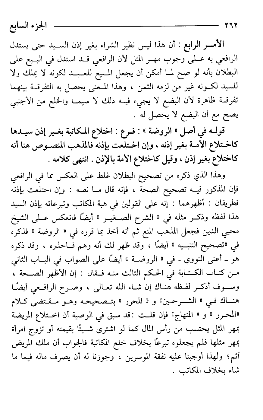 الأمر الرابع: أن هذا ليس نظير الشراء بغير إذن السيد حتى يستدل الرافعي به على وجوب مهر المثل لأن الرافعي قد استدل في البيع على البطلان بأنه لو صح لما أمكن أن يجعل المبيع للعبد لكونه لا يملك ولا للسيد لكونه غير من لزمه الثمن، وهذا المعنى يحصل به التفرقة بينهما تفرقة ظاهرة لأن البضع لا يجيء فيه ذلك لاسيما والخلع من الأجنبي يصح مع أن البضع لا يحصل له.