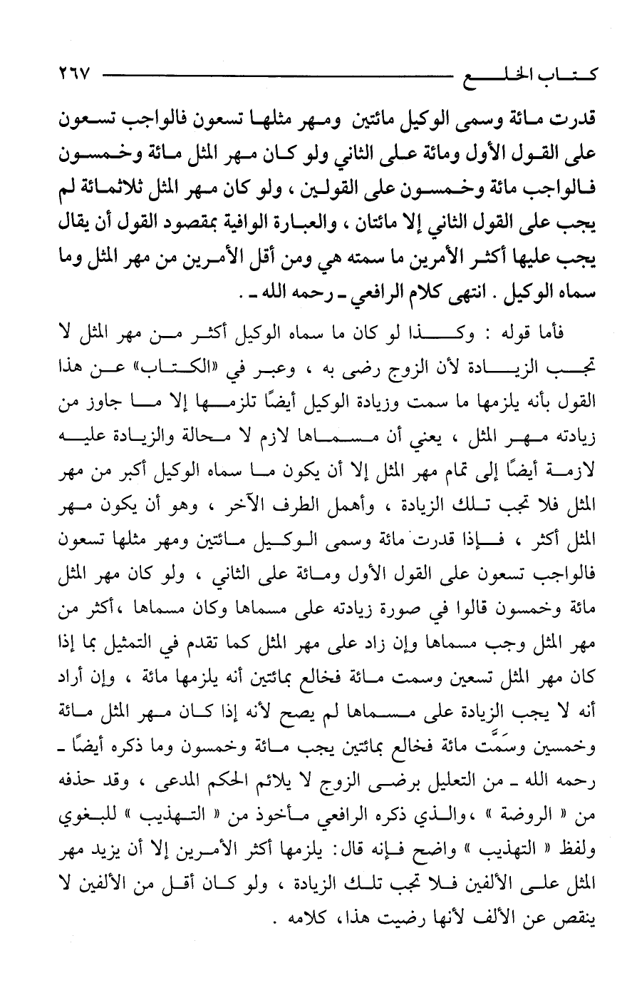 قدرت مائة وسمى الوكيل مائتين ومهر مثلها تسعون فالواجب تسعون على القول الأول ومائة على الثاني ولو كان مهر المثل مائة وخمسون فالواجب مائة وخمسون على القولين، ولو كان مهر المثل ثلاثمائة لم يجب على القول الثاني إلا مائتان، والعبارة الوافية بمقصود القول أن يقال يجب عليها أكثر الأمرين ما سمته هي ومن أقل الأمرين من مهر المثل وما سماه الوكيل. انتهى كلام الرافعي -رحمه الله-.