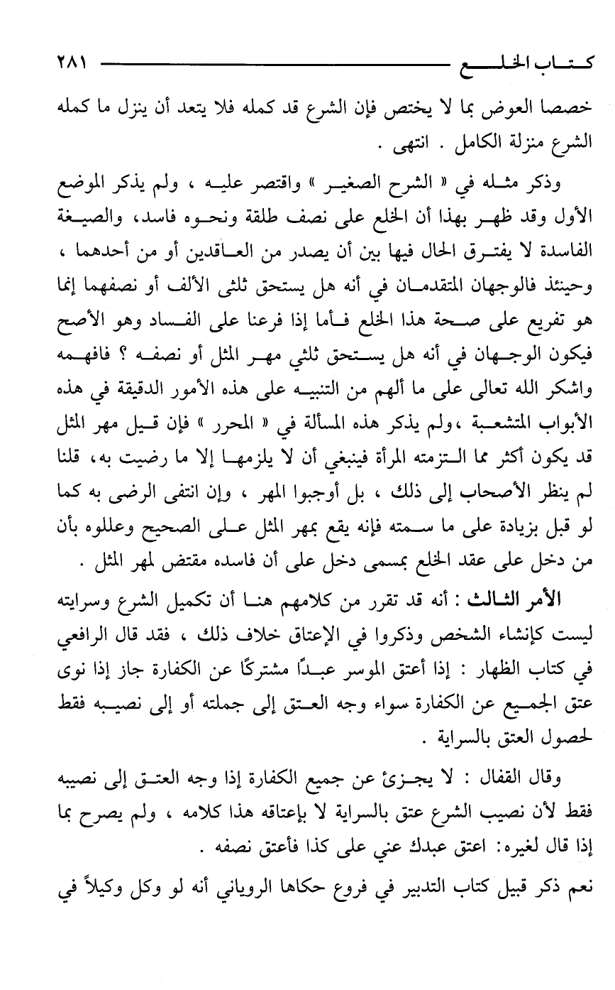 الأمر الثالث: أنه قد تقرر من كلامهم هنا أن تكميل الشرع وسرايته ليست كإنشاء الشخص وذكروا في الإعتاق خلاف ذلك، فقد قال الرافعي في كتاب الظهار: إذا أعتق الموسر عبدًا مشتركًا عن الكفارة جاز إذا نوى عتق الجميع عن الكفارة سواء وجه العتق إلى جملته أو إلى نصيبه فقط لحصول العتق بالسراية.
