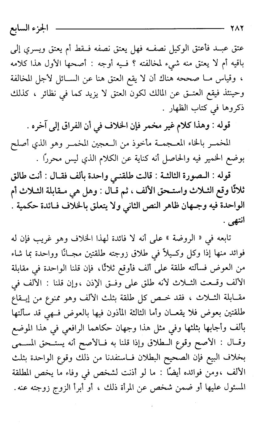 تابعه في "الروضة" على أنه لا فائدة لهذا الخلاف وهو غريب فإن له فوائد منها إذا وكل وكيلًا في طلاق زوجته طلقتين مجانًا وواحدة بما شاء من العوض فسألته طلقة على ألف فأوقع ثلاثًا، فإن قلنا الواحدة في مقابلة الألف وقعت الثلاث لأنه طلق على وفق الإذن، وإن قلنا: الألف في مقابلة الثلاث، فقد خص كل طلقة بثلث الألف وهو ممنوع من إيقاع طلقتين بعوض فلا يقعان وأما الثالثة المأذون فيها بالعوض فهي قد سألتها بألف وأجابها بثلثها وفي مثل هذا وجهان حكاهما الرافعي في هذا الموضع وقال: الأصح وقوع الطلاق وإذا قلنا به فالأصح أنه يستحق المسمى بخلاف البيع فإن الصحيح البطلان فاستفدنا من ذلك وقوع الواحدة بثلث الألف، ومن فوائده أيضًا: ما لو أذنت لشخص في وفاء ما يخص المطلقة المسئول عليها أو ضمن شخص عن المرأة ذلك، أو أبرأ الزوج زوجته عنه.