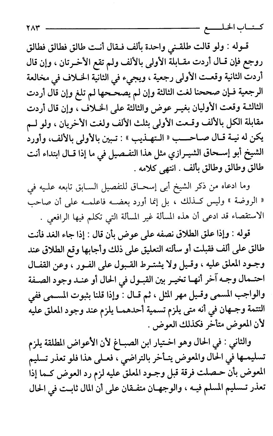قوله: وإذا علق الطلاق نصفه على عوض بأن قال: إذا جاء الغد فأنت طالق على ألف فقبلت أو سألته التعليق على ذلك وأجابها وقع الطلاق عند وجود المعلق عليه، وقيل ولا يشترط القبول على الفور، وعن القفال احتمال وجه آخر أنها تخير بين القبول في الحال أو عند وجود الصفة والواجب المسمى وقيل مهر المثل، ثم قال: وإذا قلنا بثبوت المسمى ففي التتمة وجهان في أنه متى يلزم تسمية أحدهما يلزم عند وجود المعلق عليه لأن المعوض متأخر فكذلك العوض.