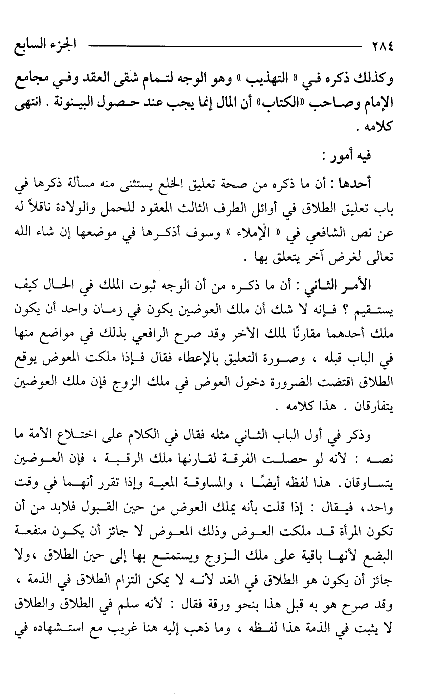 وذكر في أول الباب الثاني مثله فقال في الكلام على اختلاع الأمة ما نصه: لأنه لو حصلت الفرقة لقارنها ملك الرقبة، فإن العوضين يتساوقان. هذا لفظه أيضًا، والمساوقة المعية وإذا تقرر أنهما في وقت واحد، فيقال: إذا قلت بأنه يملك العوض من حين القبول فلابد من أن تكون المرأة قد ملكت العوض وذلك المعوض لا جائز أن يكون منفعة البضع لأنها باقية على ملك الزوج ويستمتع بها إلى حين الطلاق، ولا جائز أن يكون هو الطلاق في الغد لأنه لا يمكن التزام الطلاق في الذمة، وقد صرح هو به قبل هذا بنحو ورقة فقال: لأنه سلم في الطلاق والطلاق لا يثبت في الذمة هذا لفظه، وما ذهب إليه هنا غريب مع استشهاده في