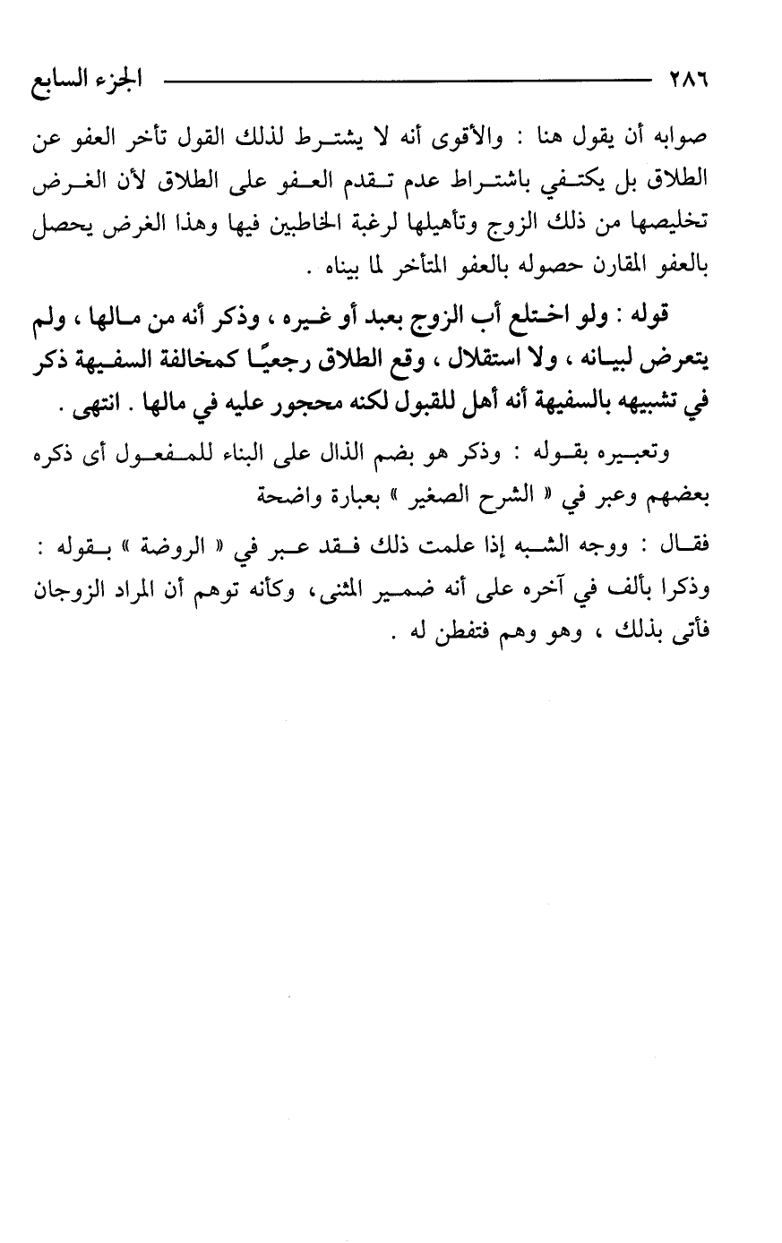 صوابه أن يقول هنا: والأقوى أنه لا يشترط لذلك القول تأخر العفو عن الطلاق بل يكتفي باشتراط عدم تقدم العفو على الطلاق لأن الغرض تخليصها من ذلك الزوج وتأهيلها لرغبة الخاطبين فيها وهذا الغرض يحصل بالعفو المقارن حصوله بالعفو المتأخر لما بيناه.