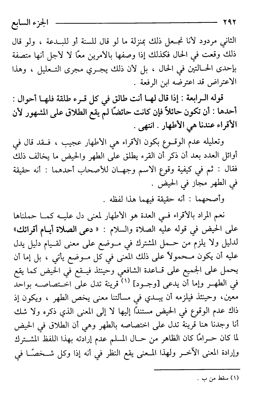وتعليله عدم الوقوع بكون الأقراء هي الأطهار عجيب، فقد قال في أوائل العدد بعد أن ذكر أن القرء يطلق على الطهر والحيض ما يخالف ذلك فقال: ثم في كيفية وقوع الاسم وجهان للأصحاب أحدهما: أنه حقيقة في الطهر مجاز في الحيض.
