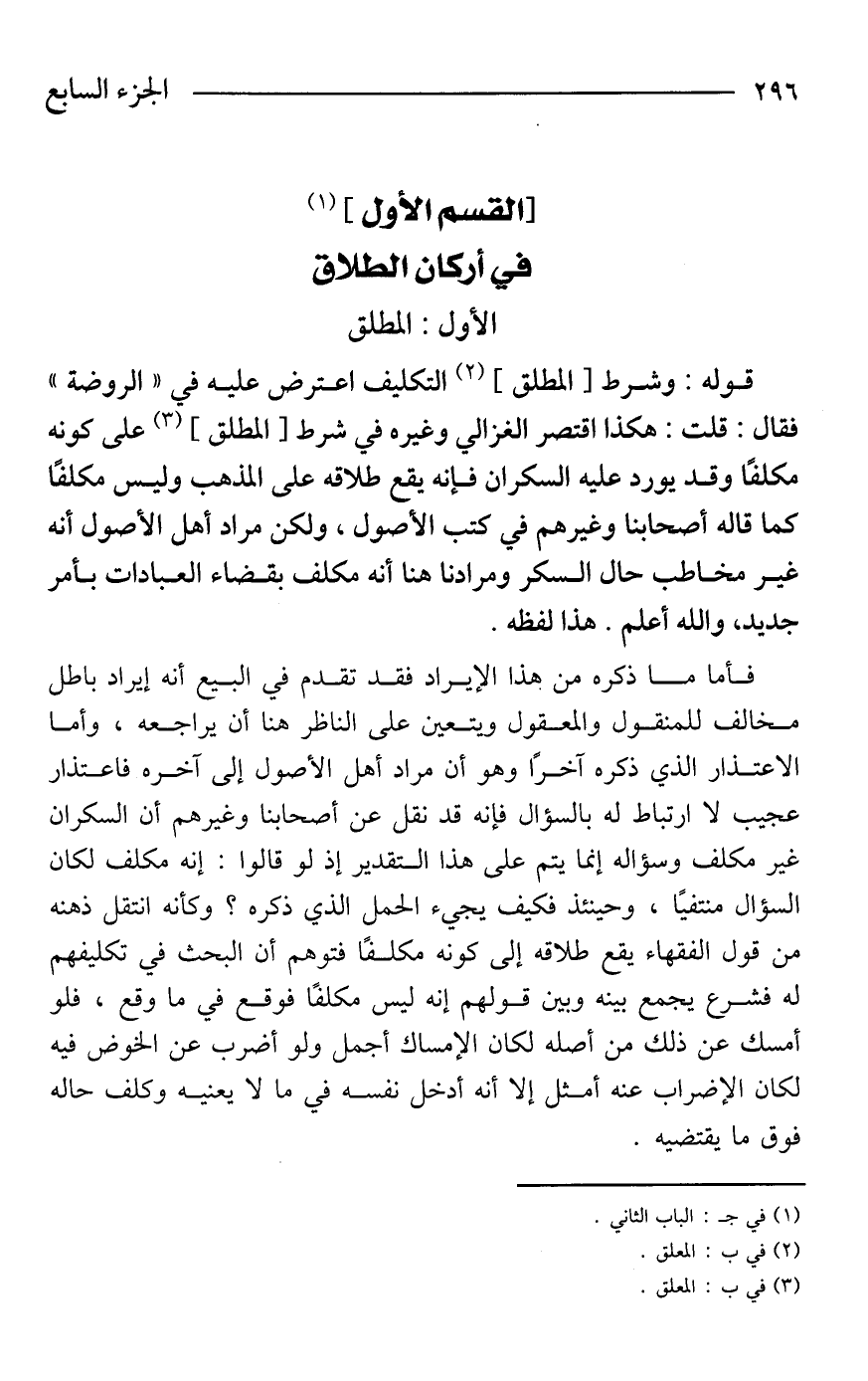 فأما ما ذكره من هذا الإيراد فقد تقدم في البيع أنه إيراد باطل مخالف للمنقول والمعقول ويتعين على الناظر هنا أن يراجعه، وأما الاعتذار الذي ذكره آخرًا وهو أن مراد أهل الأصول إلى آخره فاعتذار عجيب لا ارتباط له بالسؤال فإنه قد نقل عن أصحابنا وغيرهم أن السكران غير مكلف وسؤاله إنما يتم على هذا التقدير إذ لو قالوا: إنه مكلف لكان السؤال منتفيًا، وحينئذ فكيف يجيء الحمل الذي ذكره؟ وكأنه انتقل ذهنه من قول الفقهاء يقع طلاقه إلى كونه مكلفًا فتوهم أن البحث في تكليفهم له فشرع يجمع بينه وبين قولهم إنه ليس مكلفًا فوقع في ما وقع، فلو أمسك عن ذلك من أصله لكان الإمساك أجمل ولو أضرب عن الخوض فيه لكان الإضراب عنه أمثل إلا أنه أدخل نفسه في ما لا يعنيه وكلف حاله فوق ما يقتضيه.