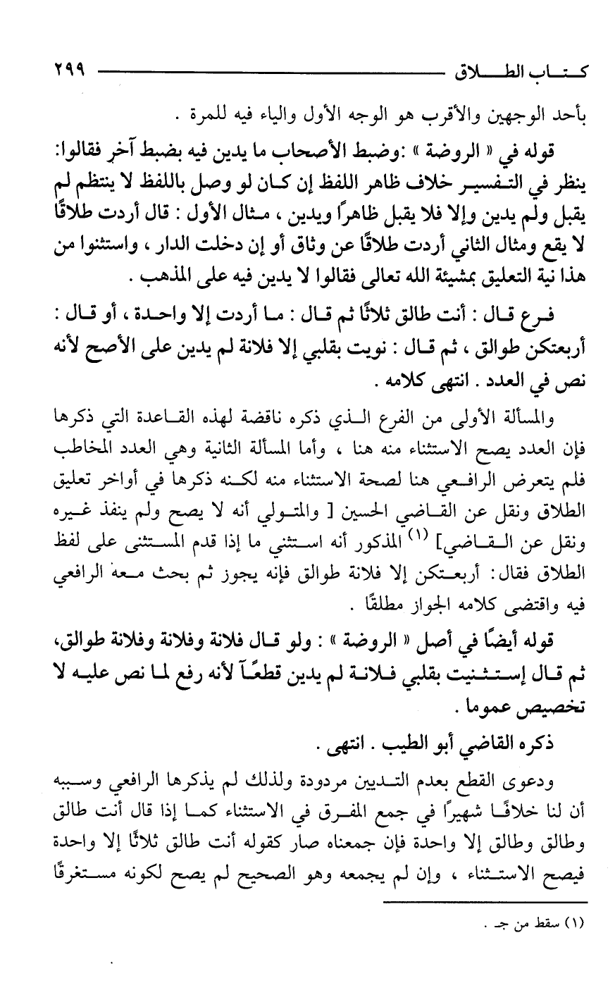 قوله أيضًا في أصل "الروضة": ولو قال فلانة وفلانة وفلانة طوالق، ثم قال إستثنيت بقلبي فلانة لم يدين قطعًا لأنه رفع لما نص عليه لا تخصيص عموما.