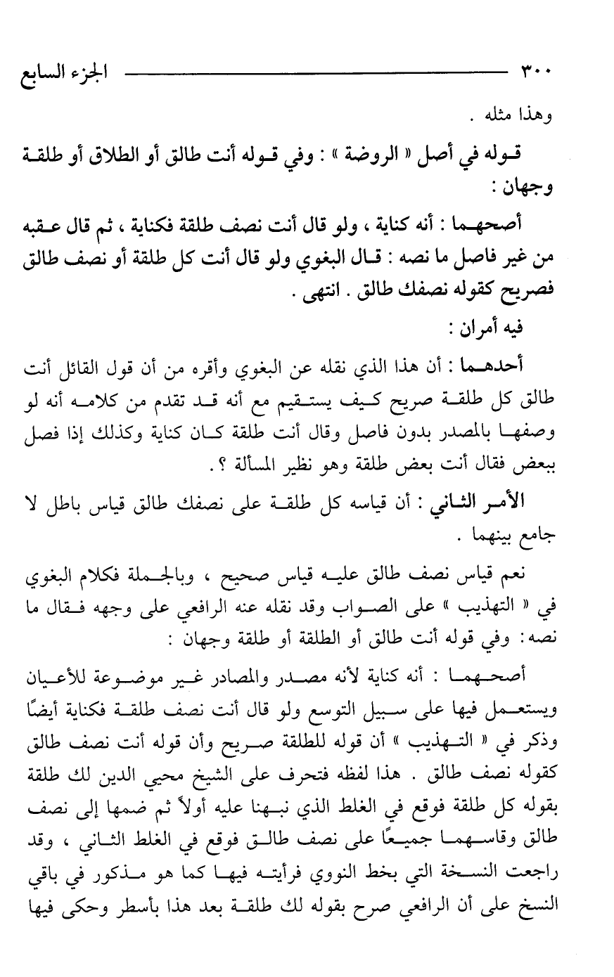 نعم قياس نصف طالق عليه قياس صحيح، وبالجملة فكلام البغوي في "التهذيب" على الصواب وقد نقله عنه الرافعي على وجهه فقال ما نصه: وفي قوله أنت طالق أو الطلقة أو طلقة وجهان: