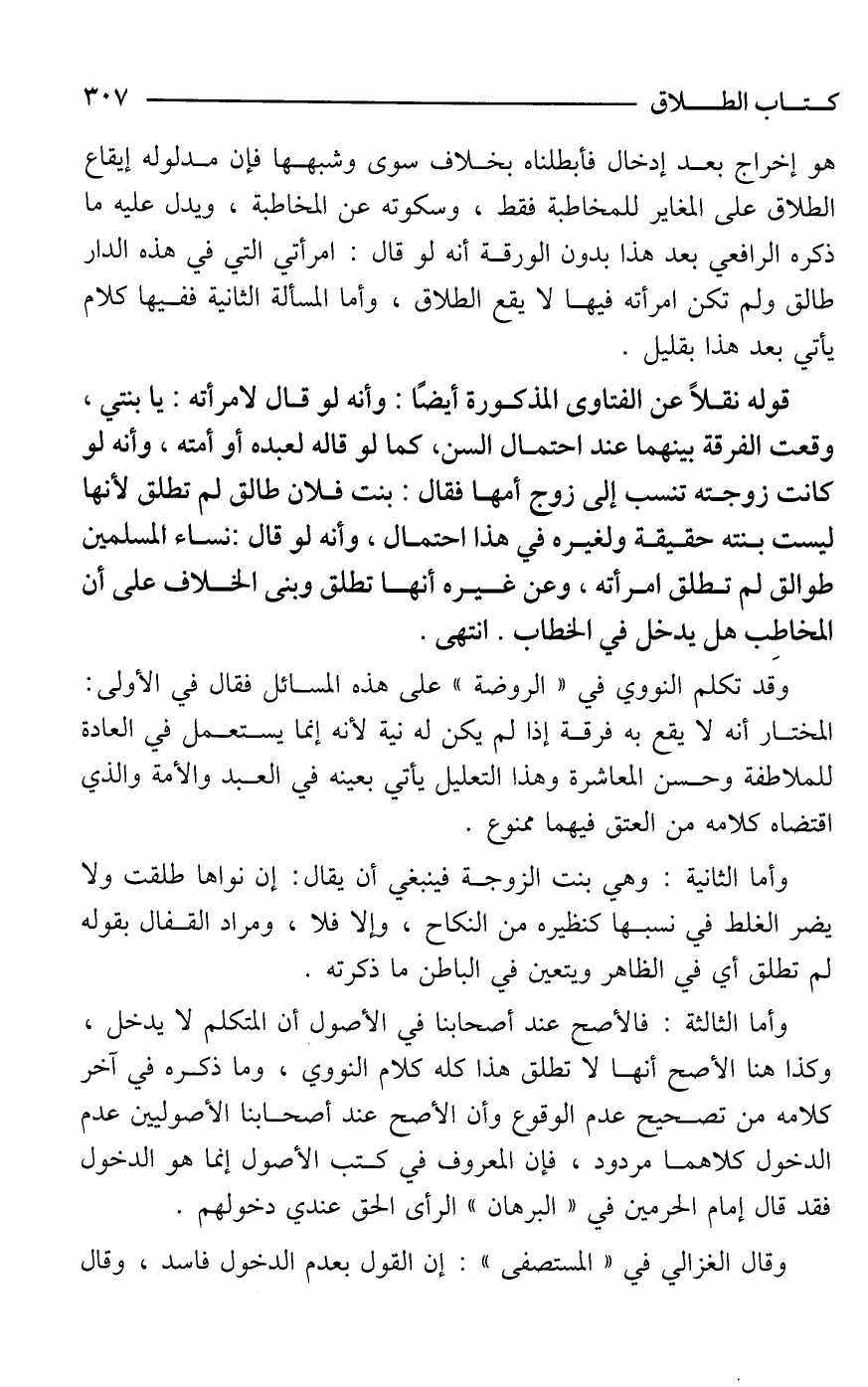 وأما الثالثة: فالأصح عند أصحابنا في الأصول أن المتكلم لا يدخل، وكذا هنا الأصح أنها لا تطلق هذا كله كلام النووي، وما ذكره في آخر كلامه من تصحيح عدم الوقوع وأن الأصح عند أصحابنا الأصوليين عدم الدخول كلاهما مردود، فإن المعروف في كتب الأصول إنما هو الدخول فقد قال إمام الحرمين في "البرهان" الرأى الحق عندي دخولهم.