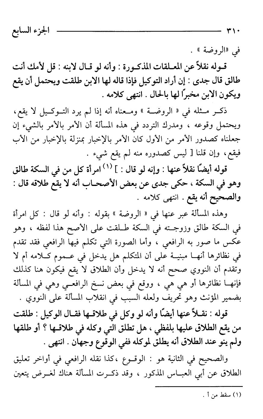 قوله: نقلًا عنها أيضًا وأنه لو وكل في طلاقها فقال الوكيل: طلقت من يقع الطلاق عليها بلفظي، هل تطلق التي وكله في طلاقها؟ أو طلقها ولم ينو عند الطلاق أنه يطلق لموكله ففي الوقوع وجهان. انتهى.