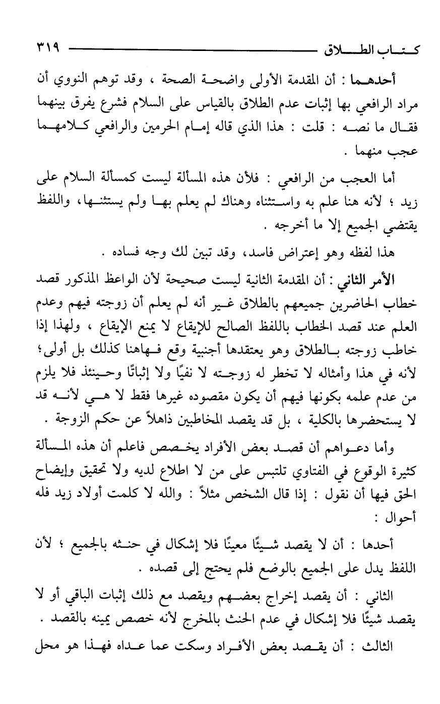 أحدهما: أن المقدمة الأولى واضحة الصحة، وقد توهم النووي أن مراد الرافعي بها إثبات عدم الطلاق بالقياس على السلام فشرع يفرق بينهما فقال ما نصه: قلت: هذا الذي قاله إمام الحرمين والرافعي كلامهما عجب منهما.