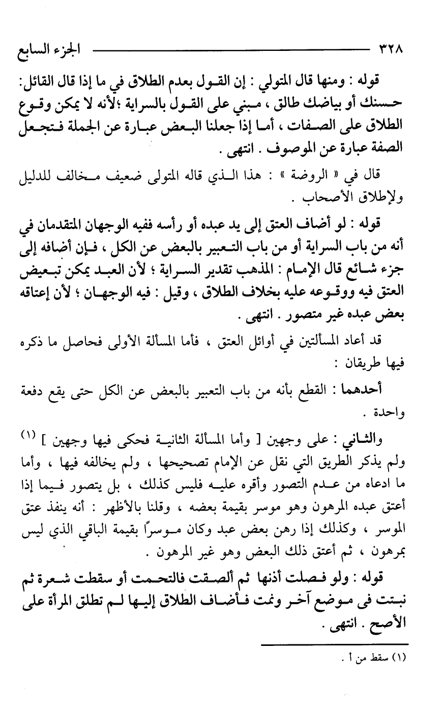 قوله: ومنها قال المتولي: إن القول بعدم الطلاق في ما إذا قال القائل: حسنك أو بياضك طالق، مبني على القول بالسراية؛ لأنه لا يمكن وقوع الطلاق على الصفات، أما إذا جعلنا البعض عبارة عن الجملة فتجعل الصفة عبارة عن الموصوف. انتهى.