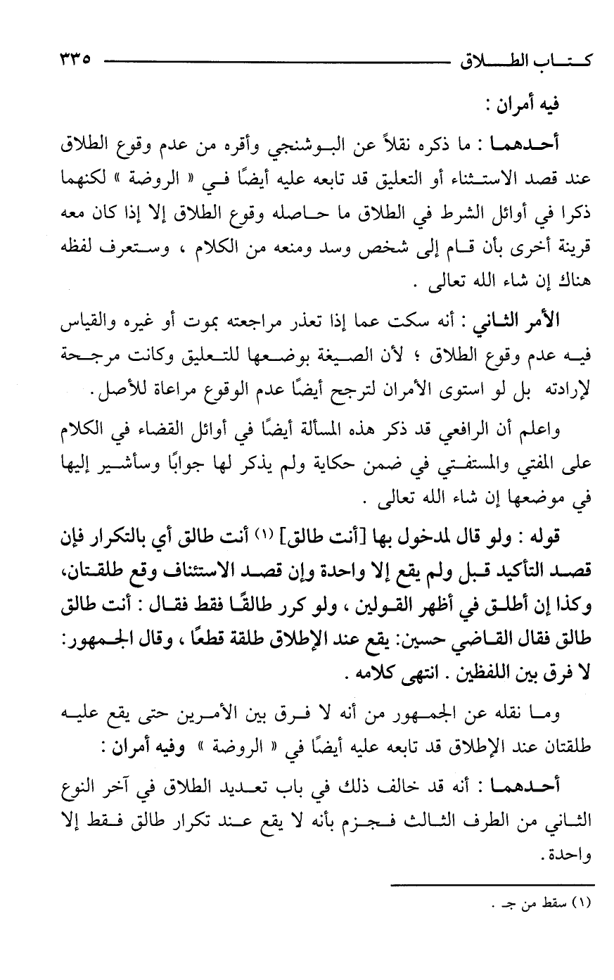 أحدهما: ما ذكره نقلًا عن البوشنجي وأقره من عدم وقوع الطلاق عند قصد الاستثناء أو التعليق قد تابعه عليه أيضًا في "الروضة" لكنهما ذكرا في أوائل الشرط في الطلاق ما حاصله وقوع الطلاق إلا إذا كان معه قرينة أخرى بأن قام إلى شخص وسد ومنعه من الكلام، وستعرف لفظه هناك إن شاء الله تعالى.