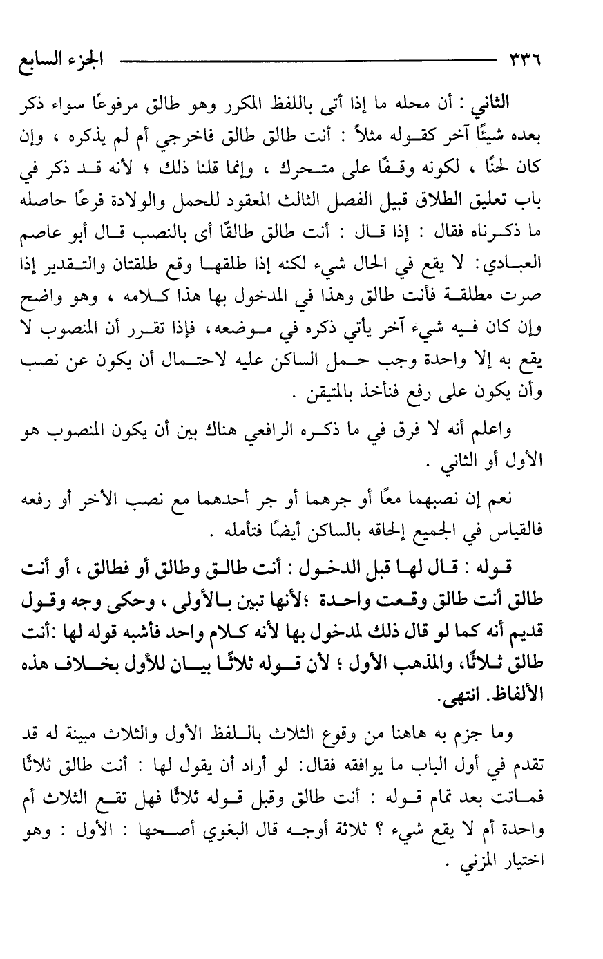 الثاني: أن محله ما إذا أتى باللفظ المكرر وهو طالق مرفوعًا سواء ذكر بعده شيئًا آخر كقوله مثلًا: أنت طالق طالق فاخرجي أم لم يذكره، وإن كان لحنًا، لكونه وقفًا على متحرك، وإنما قلنا ذلك؛ لأنه قد ذكر في باب تعليق الطلاق قبيل الفصل الثالث المعقود للحمل والولادة فرعًا حاصله ما ذكرناه فقال: إذا قال: أنت طالق طالقًا أى بالنصب قال أبو عاصم العبادي: لا يقع في الحال شيء لكنه إذا طلقها وقع طلقتان والتقدير إذا صرت مطلقة فأنت طالق وهذا في المدخول بها هذا كلامه، وهو واضح وإن كان فيه شيء آخر يأتي ذكره في موضعه، فإذا تقرر أن المنصوب لا يقع به إلا واحدة وجب حمل الساكن عليه لاحتمال أن يكون عن نصب وأن يكون على رفع فنأخذ بالمتيقن.