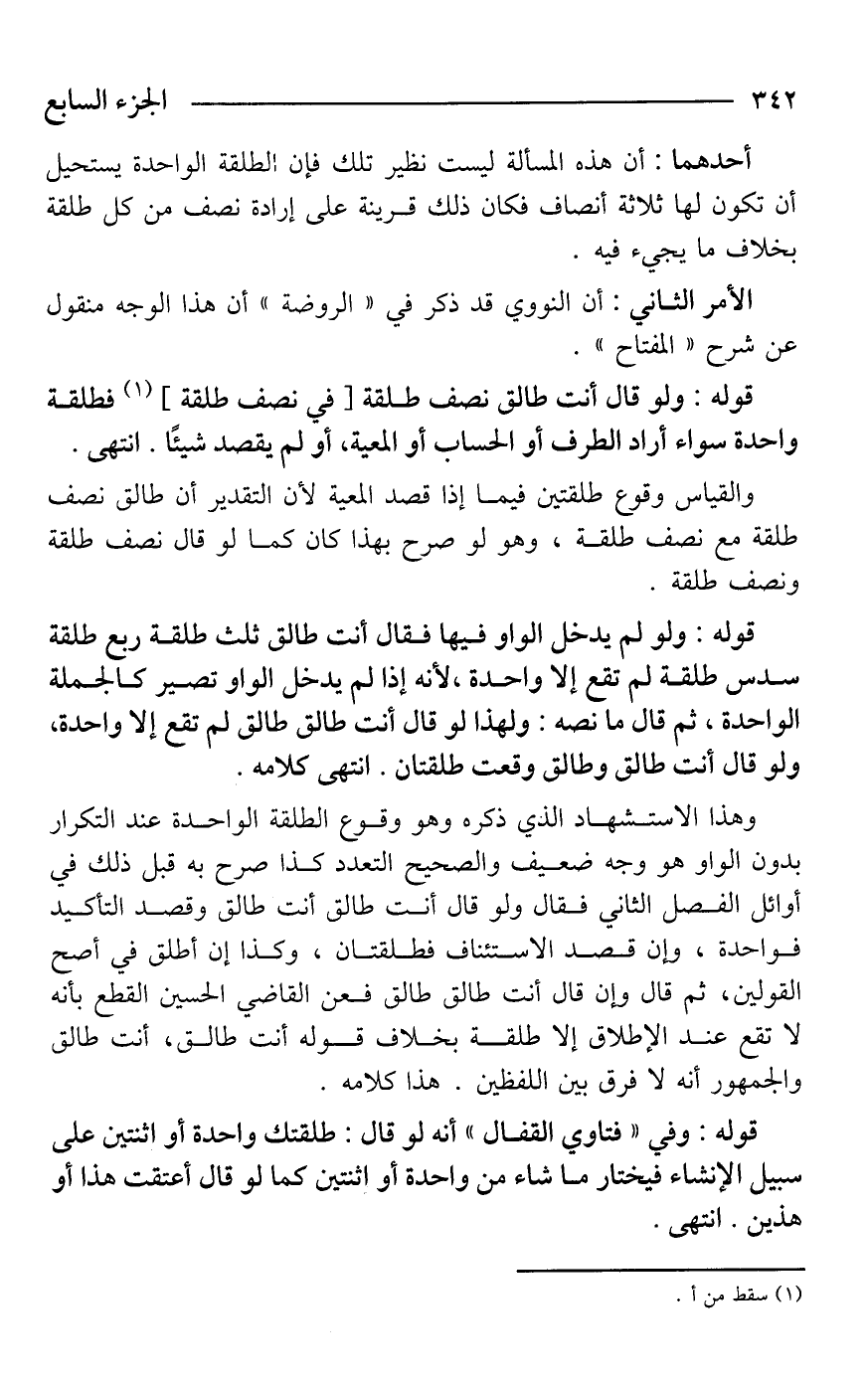 قوله: ولو لم يدخل الواو فيها فقال أنت طالق ثلث طلقة ربع طلقة سدس طلقة لم تقع إلا واحدة، لأنه إذا لم يدخل الواو تصير كالجملة الواحدة، ثم قال ما نصه: ولهذا لو قال أنت طالق طالق لم تقع إلا واحدة، ولو قال أنت طالق وطالق وقعت طلقتان. انتهى كلامه.