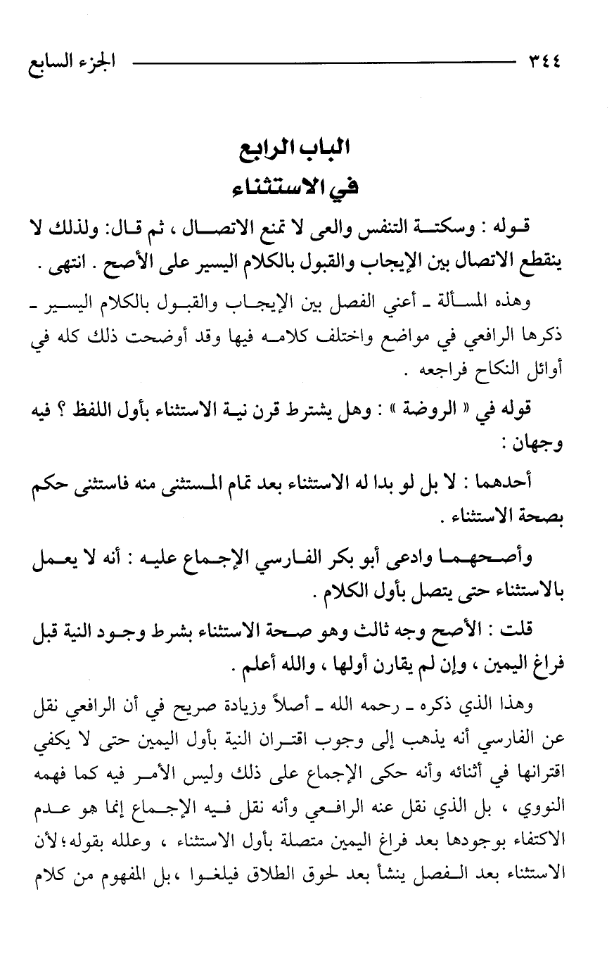 وهذا الذي ذكره -رحمه الله- أصلًا وزيادة صريح في أن الرافعي نقل عن الفارسي أنه يذهب إلى وجوب اقتران النية بأول اليمين حتى لا يكفي اقترانها في أثنائه وأنه حكى الإجماع على ذلك وليس الأمر فيه كما فهمه النووي، بل الذي نقل عنه الرافعي وأنه نقل فيه الإجماع إنما هو عدم الاكتفاء بوجودها بعد فراغ اليمين متصلة بأول الاستثناء، وعلله بقوله؛ لأن الاستثناء بعد الفصل ينشأ بعد لحوق الطلاق فيلغوا، بل المفهوم من كلام