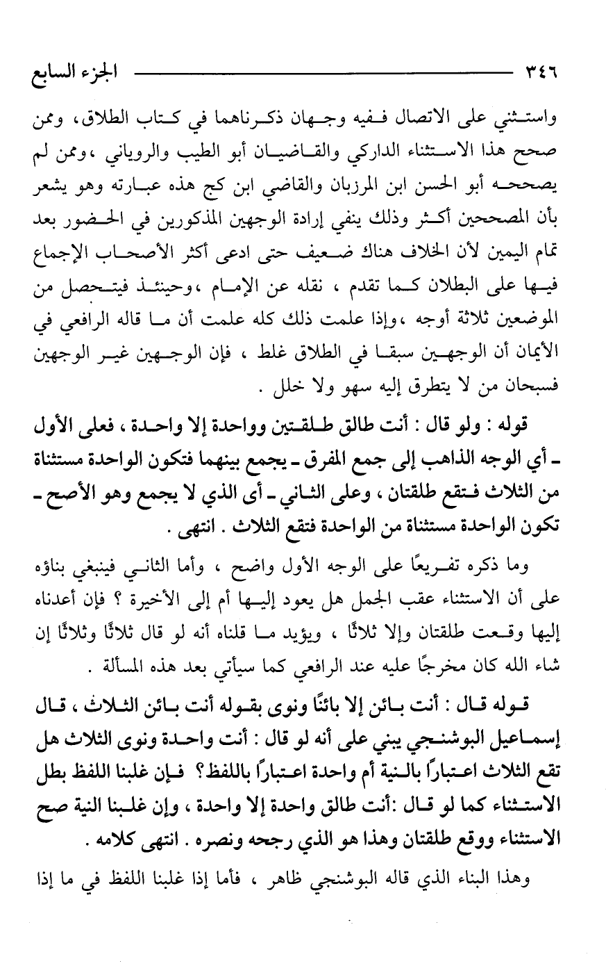 قوله قال: أنت بائن إلا بائنًا ونوى بقوله أنت بائن الثلاث، قال إسماعيل البوشنجي يبني على أنه لو قال: أنت واحدة ونوى الثلاث هل تقع الثلاث اعتبارًا بالنية أم واحدة اعتبارًا باللفظ؟ فإن غلبنا اللفظ بطل الاستثناء كما لو قال: أنت طالق واحدة إلا واحدة، وإن غلبنا النية صح الاستثناء ووقع طلقتان وهذا هو الذي رجحه ونصره. انتهى كلامه.