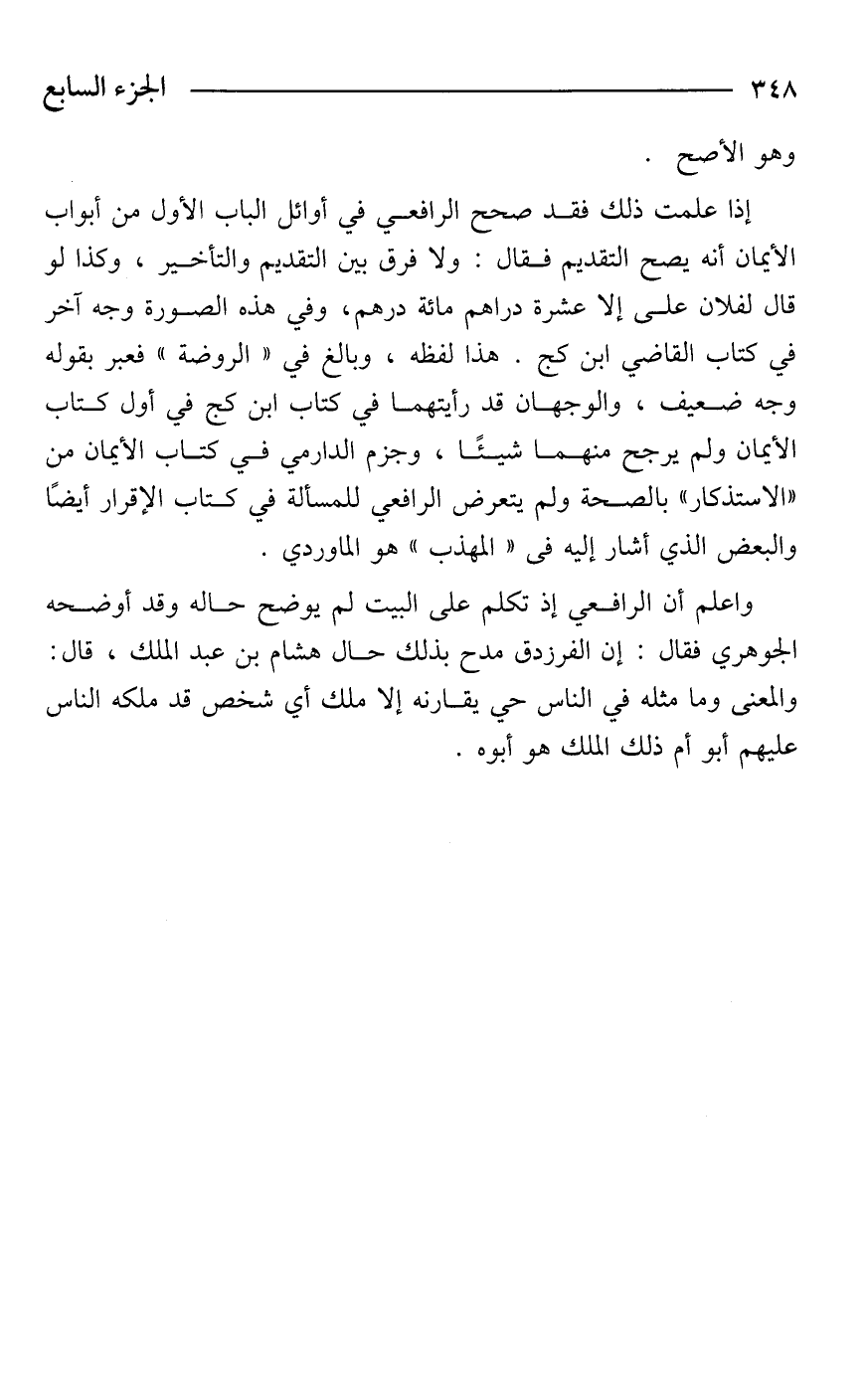 واعلم أن الرافعي إذ تكلم على البيت لم يوضح حاله وقد أوضحه الجوهري فقال: إن الفرزدق مدح بذلك حال هشام بن عبد الملك، قال: والمعنى وما مثله في الناس حي يقارنه إلا ملك أي شخص قد ملكه الناس عليهم أبو أم ذلك الملك هو أبوه.