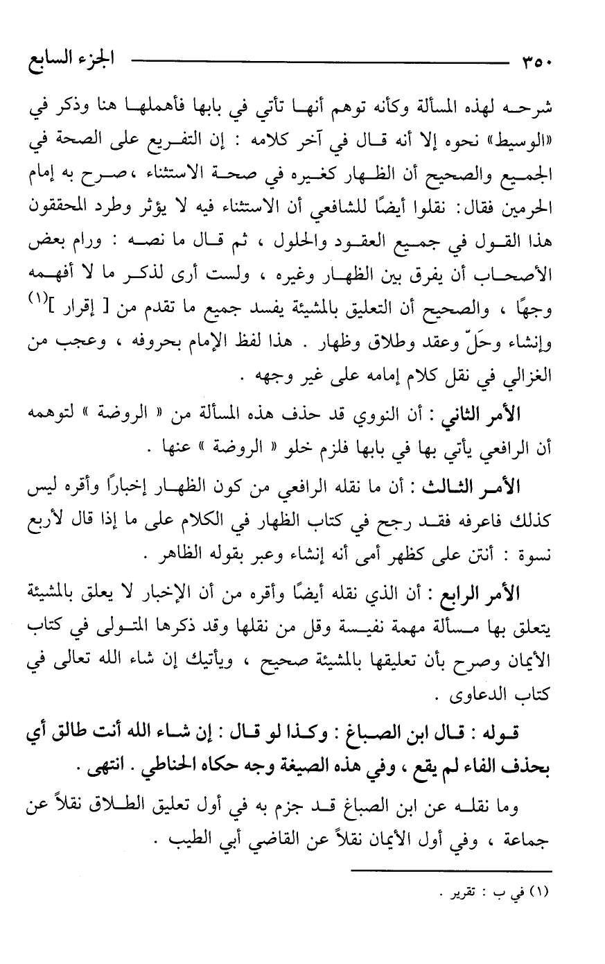 الأمر الرابع: أن الذي نقله أيضًا وأقره من أن الإخبار لا يعلق بالمشيئة يتعلق بها مسألة مهمة نفيسة وقل من نقلها وقد ذكرها المتولى في كتاب الأيمان وصرح بأن تعليقها بالمشيئة صحيح، ويأتيك إن شاء الله تعالى في كتاب الدعاوى.
