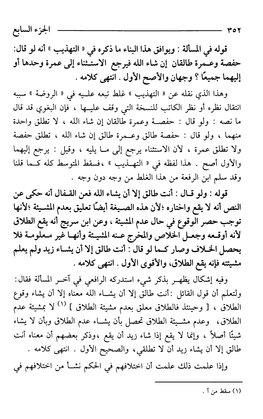 وهذا الذي نقله عن "التهذيب" غلط تبعه عليه في "الروضة" سببه انتقال نظره أو نظر الكاتب للنسخة التي وقف عليها، فإن البغوي قد قال ما نصه: ولو قال: حفصة وعمرة طالقان إن شاء الله، لا تطلق واحدة منهما، ولو قال: حفصة طالق وعمرة طالق إن شاء الله، تطلق حفصة ولا تطلق عمرة، لأن الاستثناء يرجع إلى ما يليه، وقيل: يرجع إليهما والأول أصح. هذا لفظه في "التهذيب"، فسقط المتوسط كله كما قلنا وقد سلم ابن الرفعة من هذا الغلط من وجه دون وجه.