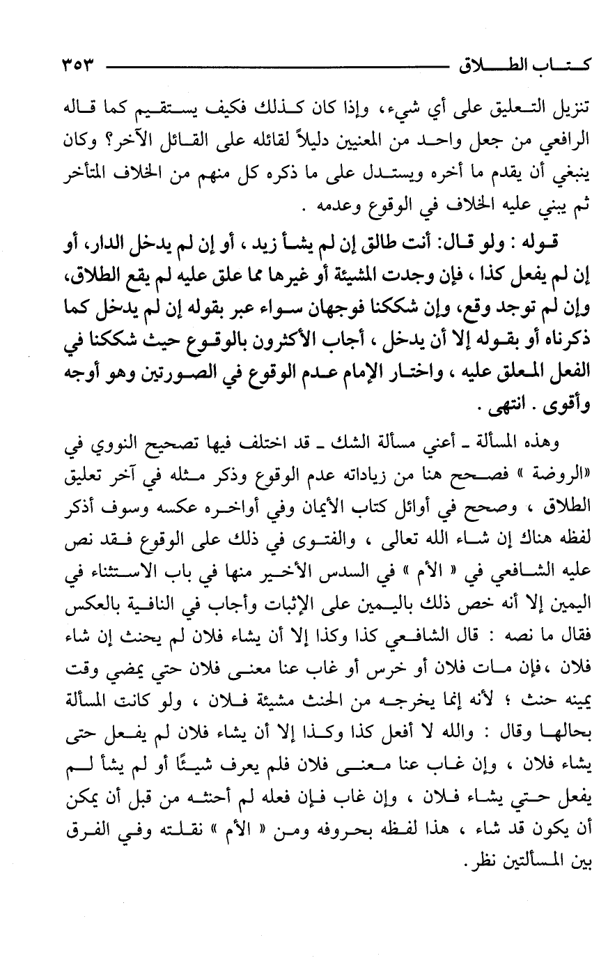 قوله: ولو قال: أنت طالق إن لم يشأ زيد، أو إن لم يدخل الدار، أو إن لم يفعل كذا، فإن وجدت المشيئة أو غيرها مما علق عليه لم يقع الطلاق، وإن لم توجد وقع، وإن شككنا فوجهان سواء عبر بقوله إن لم يدخل كما ذكرناه أو بقوله إلا أن يدخل، أجاب الأكثرون بالوقوع حيث شككنا في الفعل المعلق عليه، واختار الإمام عدم الوقوع في الصورتين وهو أوجه وأقوى , انتهى.