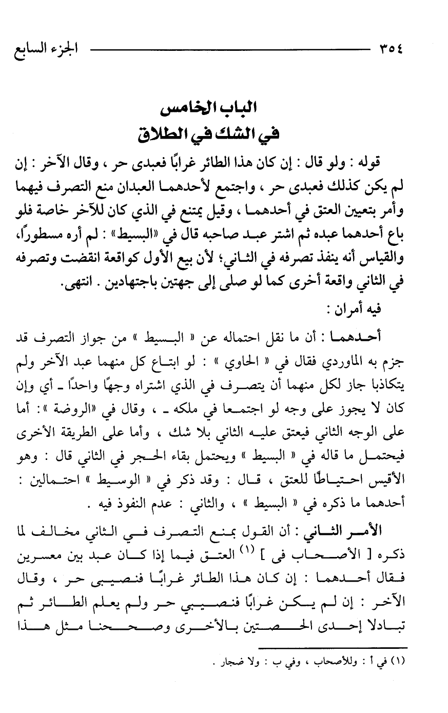 قوله: ولو قال: إن كان هذا الطائر غرابًا فعبدى حر، وقال الآخر: إن لم يكن كذلك فعبدى حر، واجتمع لأحدهما العبدان منع التصرف فيهما وأمر بتعيين العتق في أحدهما، وقيل يمتنع في الذي كان للآخر خاصة فلو باع أحدهما عبده ثم اشتر عبد صاحبه قال في "البسيط": لم أره مسطورًا، والقياس أنه ينفذ تصرفه في الثاني؛ لأن بيع الأول كواقعة انقضت وتصرفه في الثاني واقعة أخرى كما لو صلى إلى جهتين باجتهادين. انتهى.