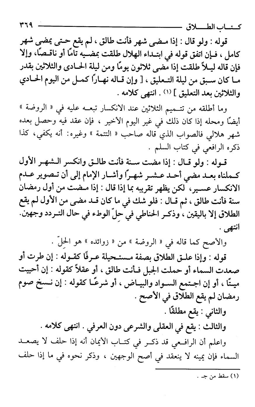 قوله: ولو قال: إذا مضت سنة فأنت طالق وانكسر الشهر الأول كملناه بعد مضي أحد عشر شهرًا وأشار الإمام إلى أن تصوير عدم الانكسار عسير، لكن يظهر تقريبه بما إذا قال: إذا مضت من أول رمضان سنة فأنت طالق، ثم قال: فلو شك في ما كان قد مضى من الأول لم يقع الطلاق إلا باليقين، وذكر الحناطي في حِلّ الوطء في حال التردد وجهين. انتهى.