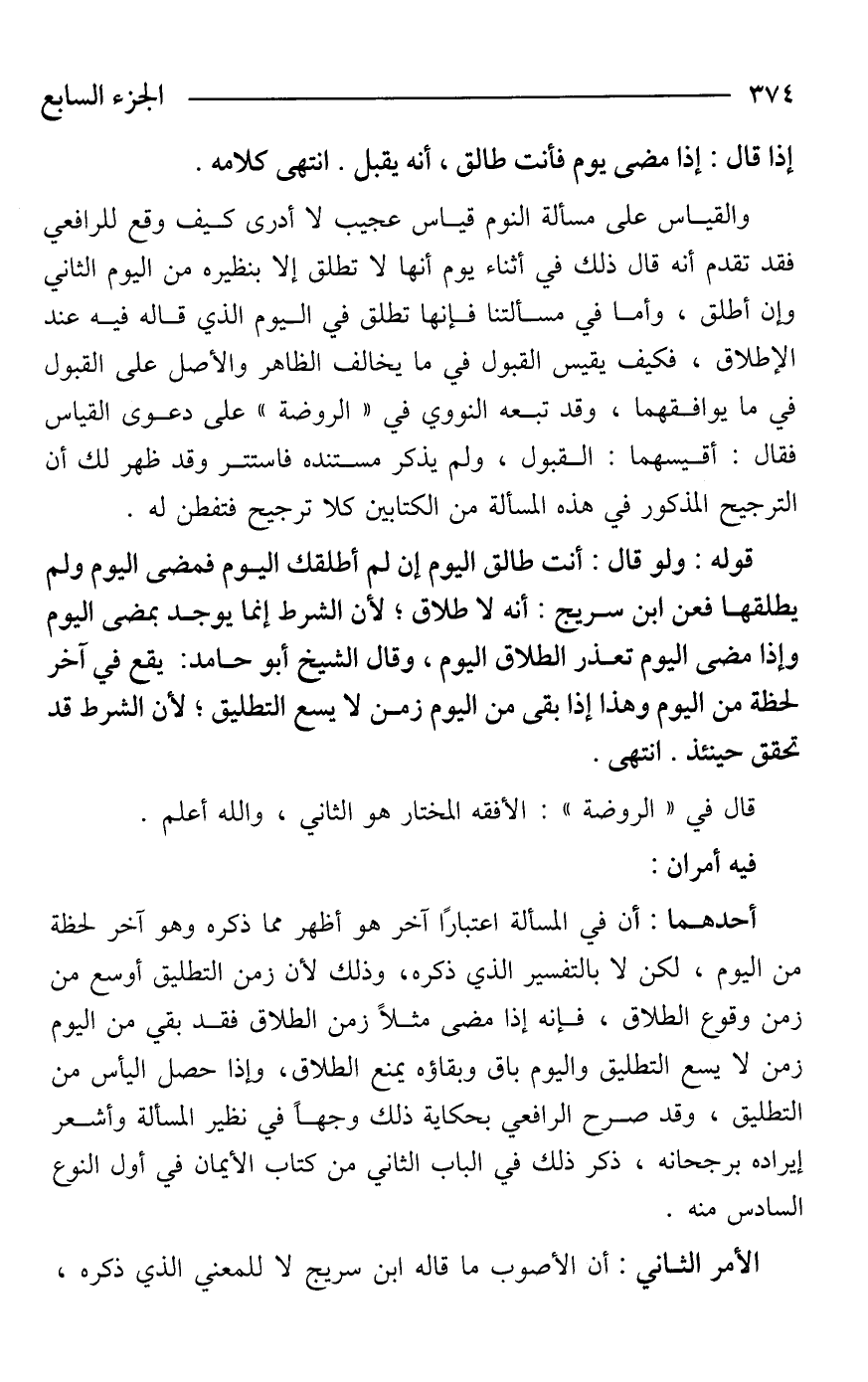 والقياس على مسألة النوم قياس عجيب لا أدرى كيف وقع للرافعي فقد تقدم أنه قال ذلك في أثناء يوم أنها لا تطلق إلا بنظيره من اليوم الثاني وإن أطلق، وأما في مسألتنا فإنها تطلق في اليوم الذي قاله فيه عند الإطلاق، فكيف يقيس القبول في ما يخالف الظاهر والأصل على القبول في ما يوافقهما، وقد تبعه النووي في "الروضة" على دعوى القياس فقال: أقيسهما: القبول، ولم يذكر مستنده فاستتر وقد ظهر لك أن الترجيح المذكور في هذه المسألة من الكتابين كلا ترجيح فتفطن له.